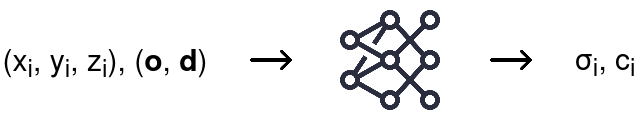 Map any 3D location [math](x, y, z)[/math] and viewing direction [math](\theta, \phi)[/math] to a volume density value [math]\sigma[/math] and a colour (emitted radiance) [math]c=(r, g, b)[/math] at that location that can then be used to render a novel view with classical volume rendering techniques
