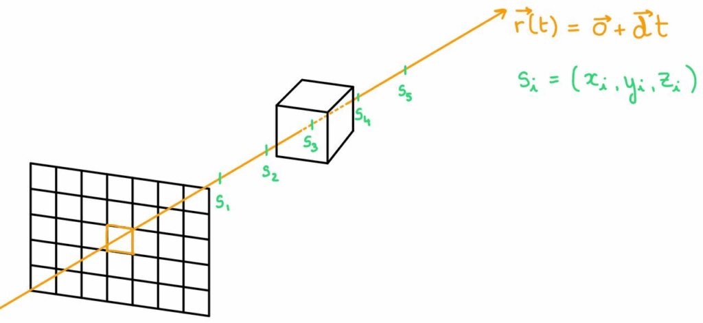 Trace a camera ray [math]r(t)[/math] through the currently shaded pixel into the scene and sample [math]s_0, s_1, …, s_N[/math] along it, [math]s_i=(x_i, y_i, z_i)[/math]